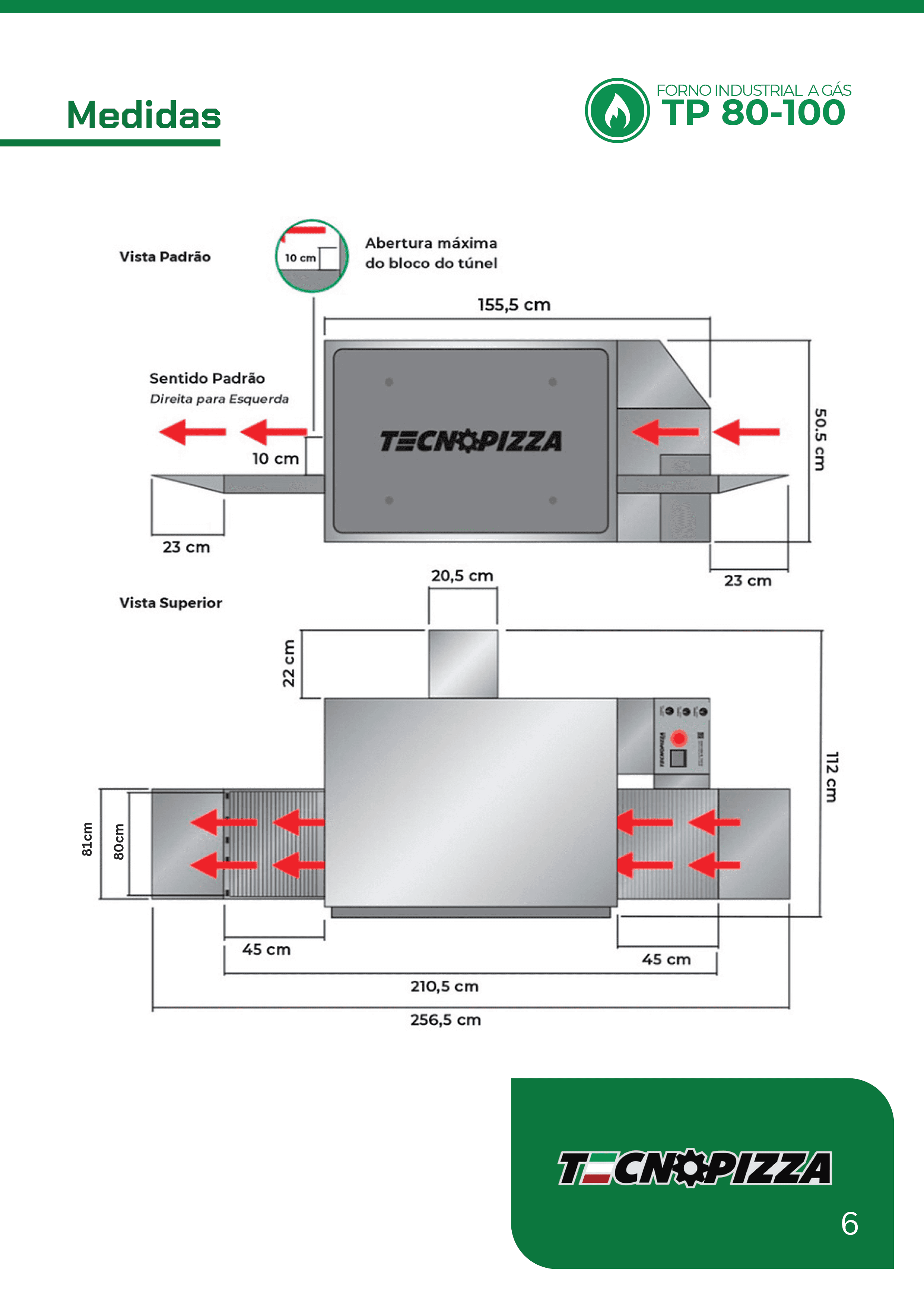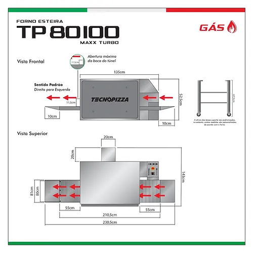 DIMENSÕES Largura: 143 cm; Altura: 52,5 cm; Comprimento: 135 cm; Comprimento da esteira: 230 cm (com aparador); Comprimento do túnel: 100 cm; Largura da esteira: 81 cm | Largura da malha: 80 cm; Peso: 254 kg. ESPECIFICAÇÕES ELÉTRICAS E TÉRMICAS Alimentação de energia: 220 volts; Consumo elétrico: 0,5 kW/h; Consumo de gás GLP: entre 1 a 1,6 kg/h; Controle de temperatura: digital; Controle de velocidade da esteira: digital; Sistema Stand By: redução de consumo em momentos ociosos; Sistema de limpeza: gaveta de fácil acesso, dispensando desmontar o forno. CAPACIDADE DE PRODUÇÃO* Capacidade de assar pizzas de até 80 cm; Produção de até 120 pizzas por hora com massa crua ou 1.600 esfihas por hora com massa crua. *Cálculo da produção/hora realizado com pizzas de 35cm, variando de acordo com o tamanho da pizza, espessura da massa e quantidade de cobertura.